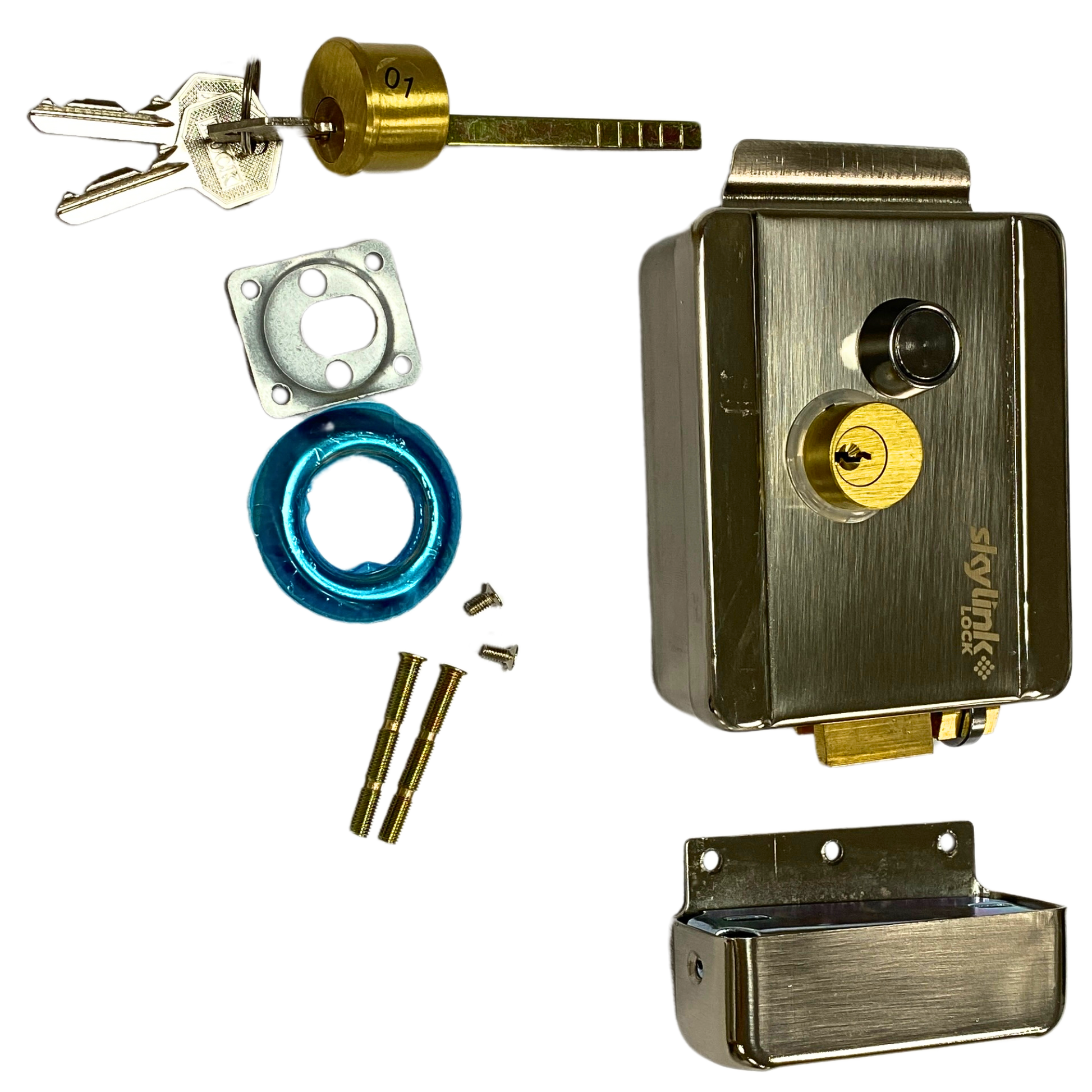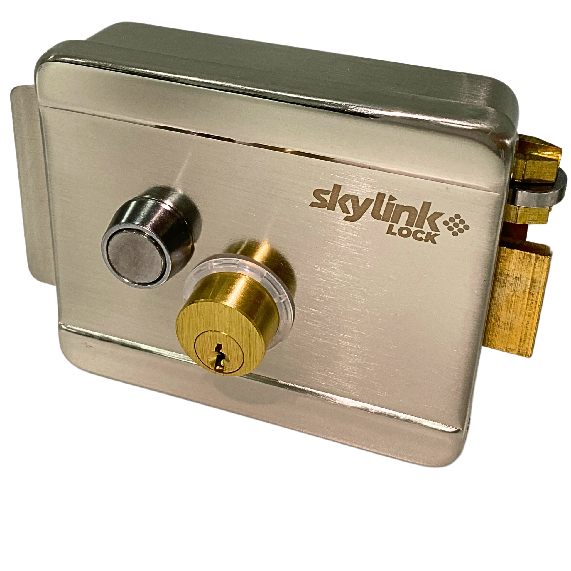 Cerradura Eléctrica Skylink diseñada para uso en exteriores, incluye botón de salida y llave para mayor seguridad. Compatible con puertas de apertura izquierda y derecha, ideal para controlar el acceso de manera eficiente y conveniente.