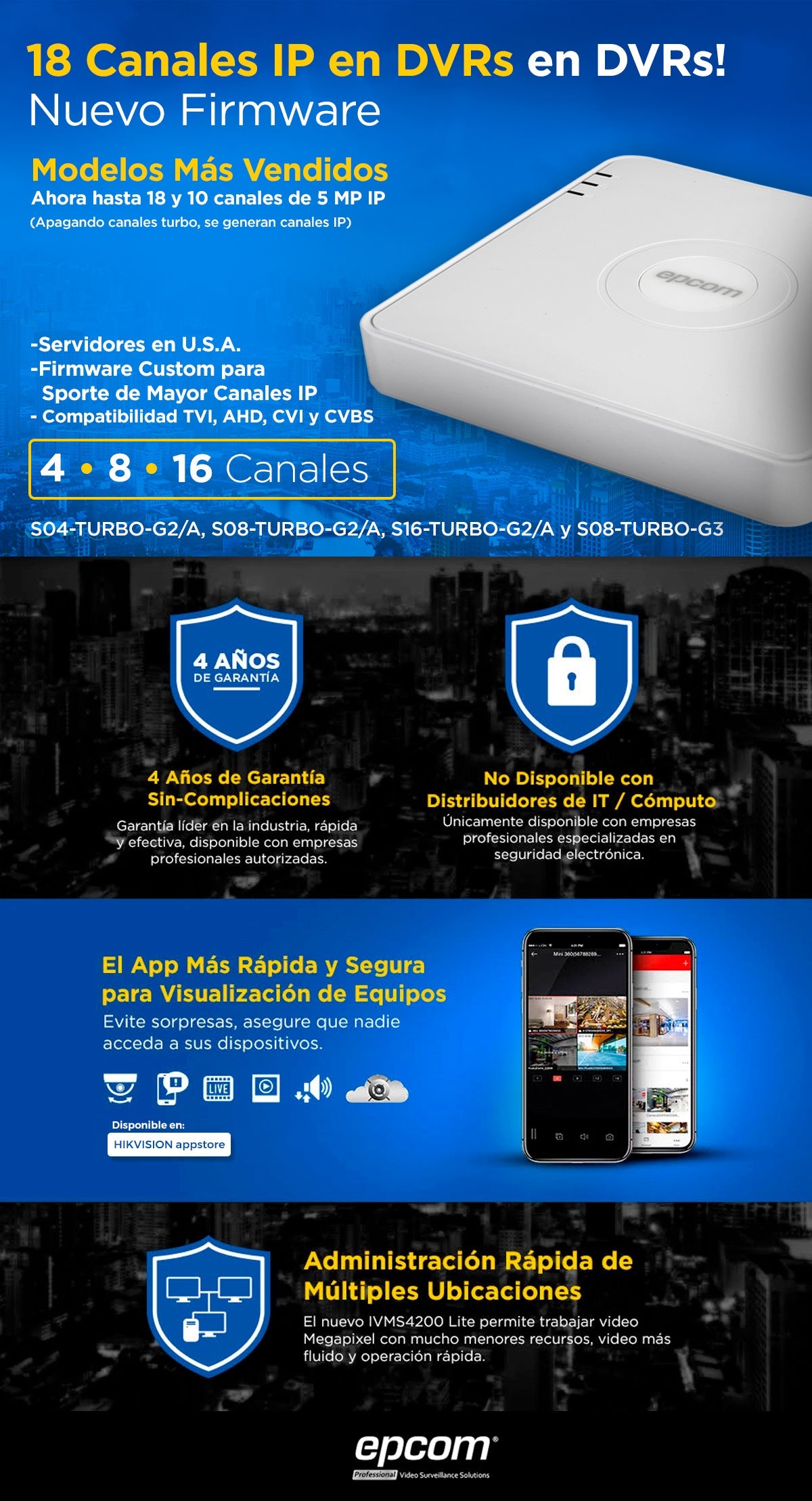 La línea de videovigilancia epcom es la unica en el mercado con 4 Años de garantía.