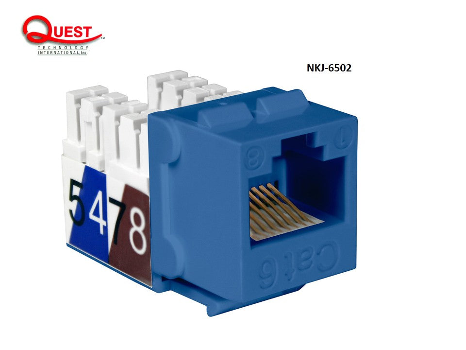Quest Cat6 NKJ-6502 Categoria 6, están diseñados con una terminación IDC 110 de 90 grados y tienen un cuerpo de estilo delgado para caber en paneles de conexión de alta densidad, cajas de montaje en superficie y placas frontales. NKJ-6502 Azul, NKJ-6503 Rojo, NKJ-6505 Amarillo, NJK-6508 Blanco.