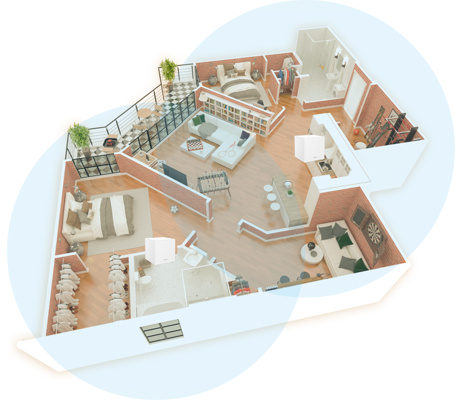 La solución de malla AC2100 de tres bandas aprovecha todo el potencial de su acceso a fibra. Tres bandas (2,4 GHz, 5 GHz-1, 5 GHz 2) se utilizan como backhaul para eliminar el retraso mientras que varios dispositivos transmiten al mismo tiempo.