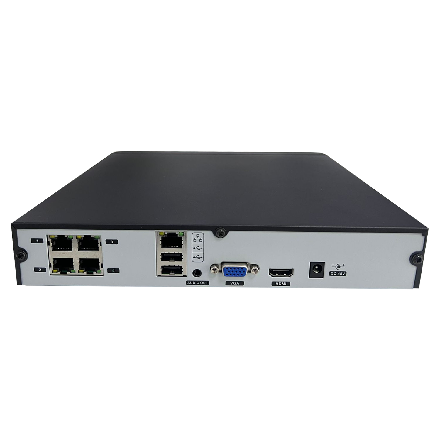 Número de canales: 4, IP estándar, 5 MP, grabación: 5 MР/3 MР /1080P/960P/720P, H.264, H.264+, H.265, H.265+, ancho de banda entrante: 40 Mbps, 1 flujo; cámaras IP: 4; PoE; disco duro: 1 SATA hasta 8 Tb; compatibilidad: Onvif Profile S, SDK; Conector: HDMI - 1; VGA - 1; puerto USB - 2xUSB 2.0; voltaje de funcionamiento: DC 48 V / 15 W (sin disco duro); color del cuerpo: negro; dimensiones: 255x210x43 mm.