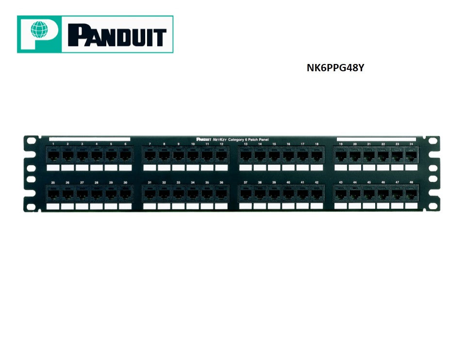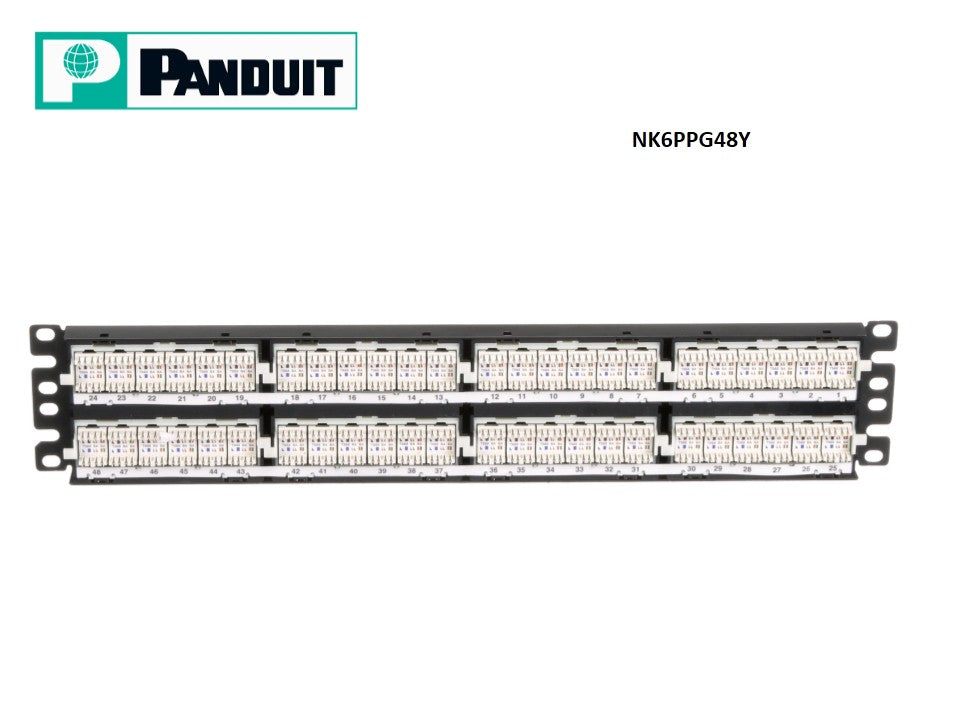 Netkey Panduit NK6PPG48Y Panel de conexión Punchdown, categoría 6, plano, 48 puertos, unidad de 2 racks. Cumple con todos los requisitos de la Categoría 6. Terminación estilo punchdown en la parte posterior del panel de conexiones.