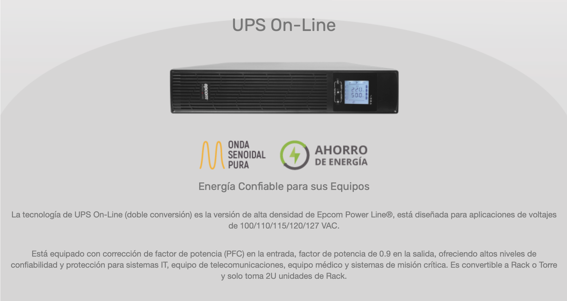 El UPS de topología On-Line (doble conversión) es la versión de alta densidad de epcom Power Line, diseñado para aplicaciones de voltajes de 100/110/115/120/127 VAC. Está equipado con corrección de factor de potencia (PFC) en la entrada, factor de potencia de 0.9 en la salida, ofreciendo altos niveles de confiabilidad y protección para sistemas IT, equipo de telecomunicaciones, equipo médico y sistemas de misión critica, es convertible a Rack o Torre y solo toma 2U unidades de Rack.